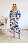 Luźny fason, kieszenie i rękawy ¾sprawiają, że z powodzeniem założysz ją do pracy, na spacer czy rodzinny obiad. Ta długa sukienka na lato sprawdzi się zarówno w biurowej stylizacji, jak i podczas weekendowego spaceru. Luźny, przewiewny krój zapewnia komfort przez cały dzień, a dzięki printowi w liście całość zyskuje świeżości i lekkości. Pasek możesz nosić dowolnie – luźno zawiązany, by nadać sukience lekkości, lub mocniej ściągnięty, aby wyeksponować talię.