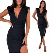 Efektowna, dopasowana sukienka o asymetrycznym kroju to kwintesencja kobiecego stylu. Poduszki na ramionach nadają sylwetce wyrazistości i elegancji, a głęboki dekolt oraz drapowania podkreślają atuty figury. Asymetryczne wykończenie dodaje stylizacji nowoczesnego charakteru.
