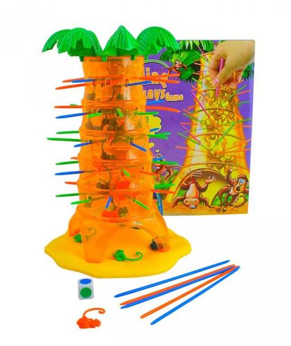 Zasady gryNa każdym z 5 poziomów drzewa układamy gałęzie - 6 słomek, po 2 w każdym z kolorów (2x niebieskie, 2x zielone, 2x czerwone). Z góry w otwór pomiędzy liśćmi drzewa, wrzucamy wszystkie małpy tak, aby zawisły na gałęziach/bierkach. Jeżeli któraś małpa spadnie na podstawę, podnosimy ją i wrzucamy od góry aż wszystkie będą wisiały na gałęziach. Po rozpoczęciu gry, każdy gracz rzuca kostką i ostrożnie wyciąga z najwyższego rzędu słomkę w kolorze, który wylosował. Małpki, które spadną na sam dół, gracz kładzie przed sobą. Na koniec gry podliczamy nasze naczelne.