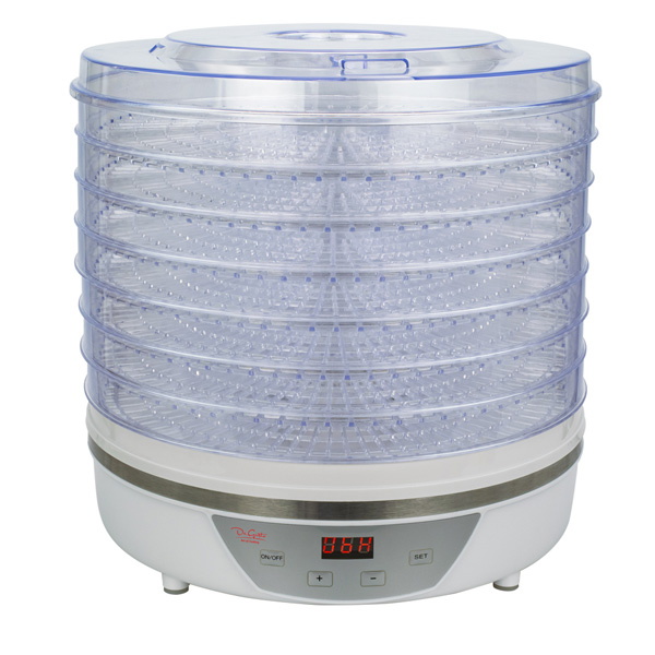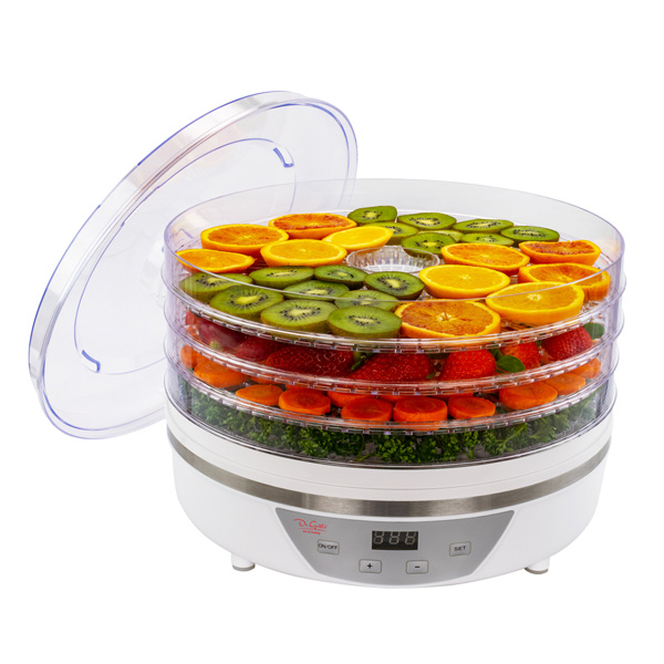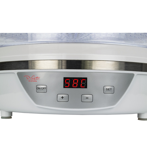 Nasza suszarka do żywności wyposażona jest w 7 tac, które umożliwiają jednoczesne suszenie większej ilości produktów. Przezroczyste tace pozwalają na bieżąco monitorować proces suszenia bez konieczności ich zdejmowania, co minimalizuje straty ciepła. Czytelny wyświetlacz LED informuje o aktualnej temperaturze wewnątrz suszarki, umożliwiając precyzyjną kontrolę nad całym procesem. Z dołączonej do produktu instrukcji dowiesz się, w jaki sposób najlepiej suszyć poszczególne produkty, by móc cieszyć się z pysznych, zdrowych i własnoręcznie przygotowanych przekąsek.