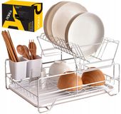 Suszarka gwarantuje pełną stabilność i wygodę, z dwupoziomową konstrukcją, która optymalizuje wykorzystanie miejsca. Górna półka doskonale mieści talerze, a dolna – kubki, miski i szklanki, podczas gdy wbudowany pojemnik na sztućce utrzymuje noże, widelce i łyżki w rzędzie, umożliwiając łatwy dostęp w każdej chwili.