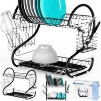 Kompaktowa, dwupoziomowa suszarka do naczyń w kolorze czarnym. Posiada miejsce na talerze, szklanki, kubki, ociekacz na sztućce oraz uchwyt na deskę do krojenia. Wyposażona w tacę ociekową.