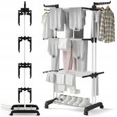 Ta zaawansowana suszarka na pranie o pionowej konstrukcji oferuje aż 20 metrów powierzchni suszenia przy wymiarach zaledwie 165 x 76 x 50 cm po złożeniu. Trzypoziomowa budowa z dodatkowymi ramionami na wieszaki oraz specjalną półką na buty zapewnia wszechstronne wykorzystanie każdego centymetra przestrzeni.