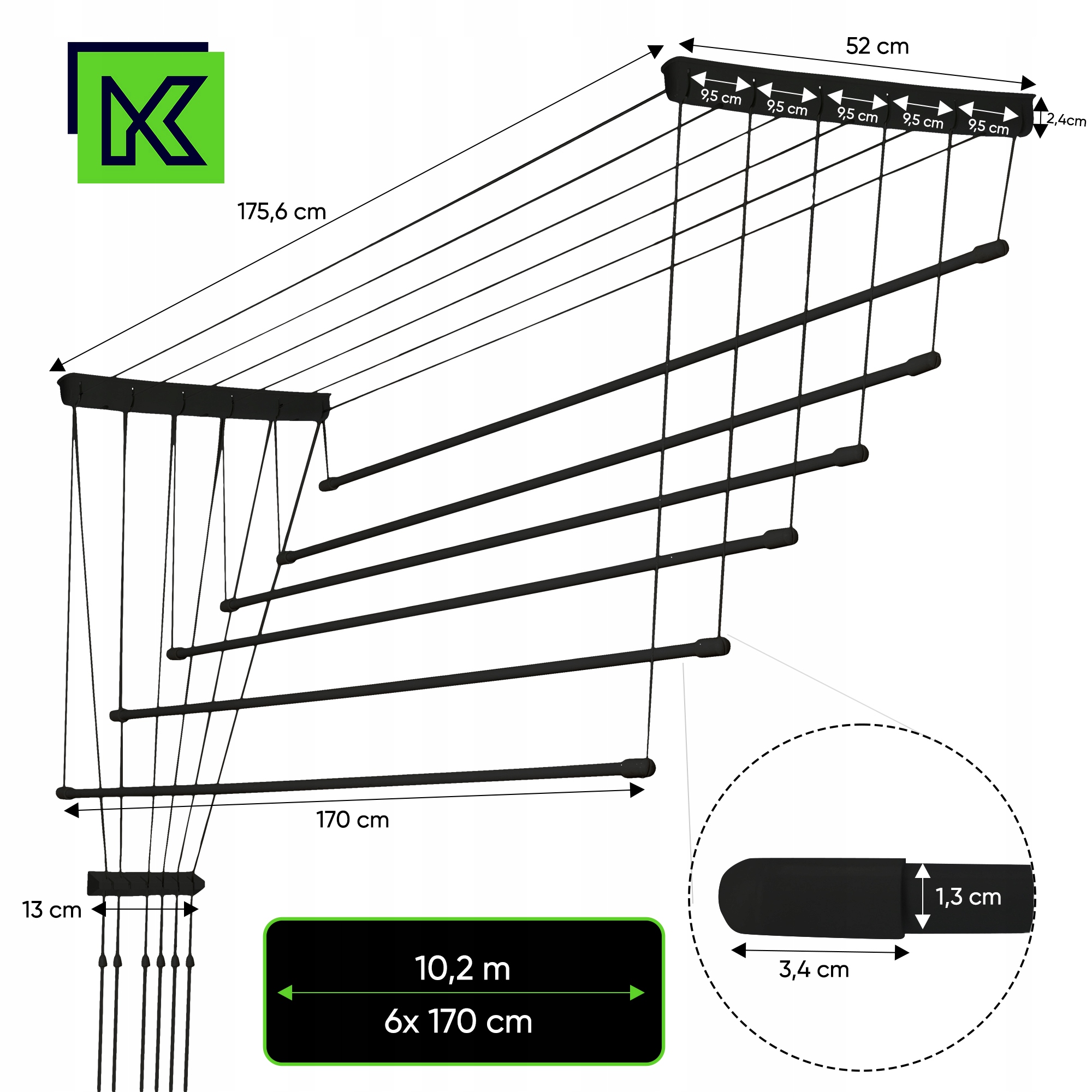 Produkt możesz zamontować w pomieszczeniach do 3 metrów wysokości. Sprawdzi się do suszenia prania wewnątrz jak i na świeżym powietrzu. Jest odporny na działanie warunków atmosferycznych i wilgoci, dlatego nie musisz obawiać się o korozję. Sprawdź, dlaczego warto mieć naszą suszarkę sufitową w swoim wyposażeniu!