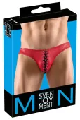 Model Svenjoyment to męskie slipy w intensywnym, czerwonym kolorze z efektowną powierzchnią o delikatnym połysku. Charakterystycznym elementem jest czarne, dekoracyjne sznurowanie umieszczone z przodu, ktore podkreśla oryginalny styl bielizny i nadaje jej nietuzinkowy charakter.