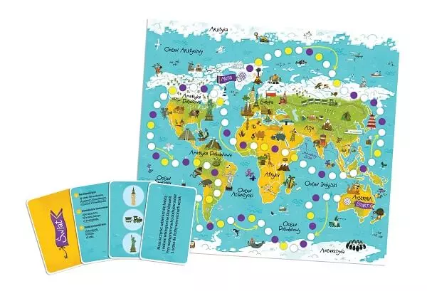 Gra „Świat” to także ćwiczenie spostrzegawczości, koncentracji i refleksu, które zachęci do wspólnej zabawy całą rodzinę. To klasyczny wyścig, w którym zwycięzcą zostanie gracz, który jako pierwszy dotrze do mety. Jest na to kilka sposobów! Pomóc może udzielenie odpowiedzi na pytania, wykonanie działania opisanego na karcie oraz wypatrzenie na planszy wskazanego zwierzęcia, rośliny lub innego obiektu.