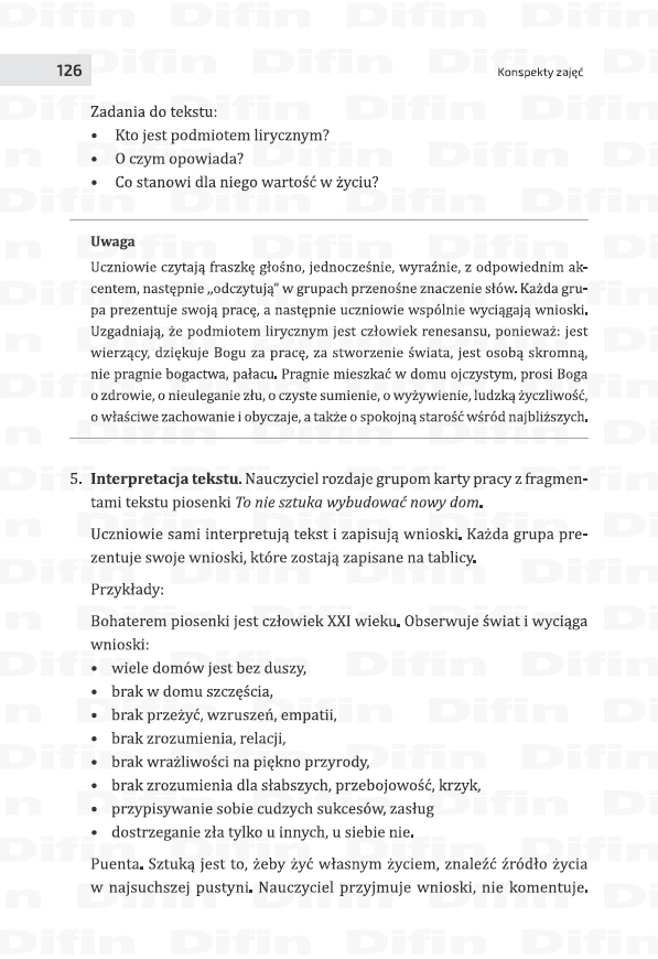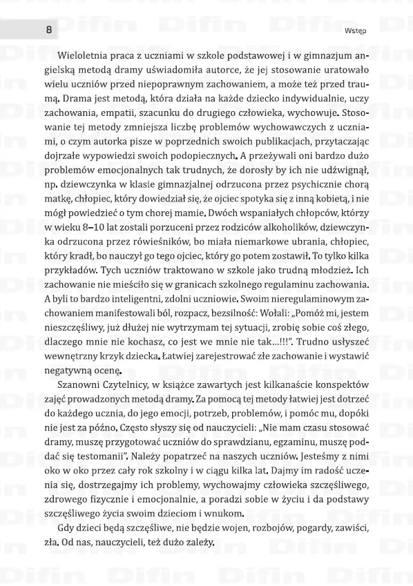Autorka po raz kolejny przygotowała publikację, która wprowadza w świat wartości, uczuć, budowania relacji, szacunku i etyki w wychowaniu młodego człowieka. Ten cenny materiał w postaci konspektów lekcji dla klas IV–VIII skierowany jest do nauczycieli, wychowawców i pedagogów i ma pomóc w pracy z uczniem w zakresie kształtowania kompetencji społecznych, rozpoznawania i nazywania emocji, radzenia sobie w trudnych dla ucznia sytuacjach. Jako polonistka, autorka proponuje do wykorzystania przykłady bohaterów literackich, metodę dramy i umiejętnie łączy je z rzeczywistymi sytuacjami.