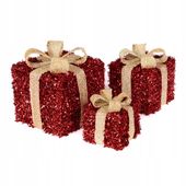 Ten wysokiej jakości zestaw świątecznych pudełek LED w intensywnie czerwonym kolorze ze złotymi wstążkami i kokardami wyróżnia się nie tylko eleganckim wykończeniem, ale także precyzyjnym wykonaniem. Trzy pudełka w rozmiarach 30 cm, 20 cm i 10 cm z ciepłym światłem LED tworzą subtelny blask, który idealnie ożywia świąteczną atmosferę i zapewnia długotrwałe, niezawodne oświetlenie.