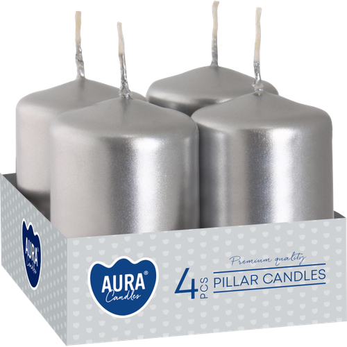 Zestaw czterech małych świec pieńkowych marki AURA w eleganckim, srebrnym metalicznym kolorze, który nadaje wnętrzu nowoczesny i subtelny, luksusowy charakter. Walce w tej barwie to doskonały wybór na dekorację dowolnego stołu, idealne na przyjęcia, bankiety, wesela czy kolacje. Srebrne świece wprowadzają spokój, blask i elegancką, relaksującą atmosferę w salonie, sypialni czy łazience. To ponadczasowy wybór na święta, rocznice czy inne wyjątkowe momenty.