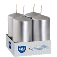Zestaw czterech małych świec pieńkowych marki AURA w eleganckim, srebrnym metalicznym kolorze, który nadaje wnętrzu nowoczesny i subtelny, luksusowy charakter. Walce w tej barwie to doskonały wybór na dekorację dowolnego stołu, idealne na przyjęcia, bankiety, wesela czy kolacje. Srebrne świece wprowadzają spokój, blask i elegancką, relaksującą atmosferę w salonie, sypialni czy łazience. To ponadczasowy wybór na święta, rocznice czy inne wyjątkowe momenty.