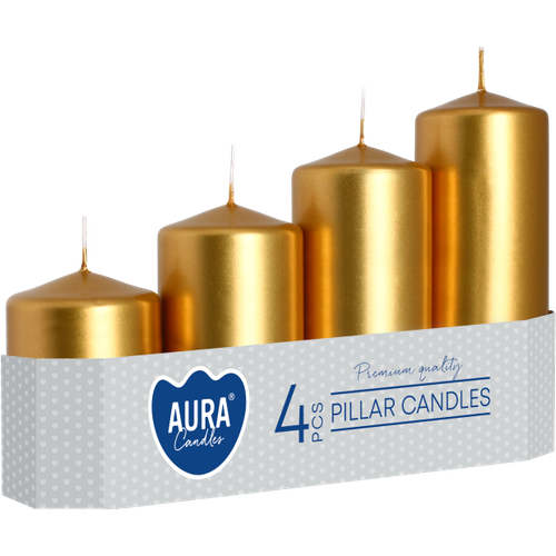 Zestaw czterech stopniowanych świec pieńkowych marki AURA w eleganckim, złotym metalicznym kolorze to doskonały wybór zarówno na co dzień, jak i na wyjątkowe okazje. Walce w tej szlachetnej, połyskującej barwie idealnie podkreślą dekoracje świątecznych stołów, glamour aranżacje oraz stylowe wnętrza. Umieszczone w różnych stylizacjach tworzą ciepłą, luksusową i przytulną atmosferę podczas spotkań. Wotywne świeczki w odcieniu złotego metaliku stanowią efektowne dopełnienie dekoracji sezonowych, pięknie komponując się z zielenią, czernią, bielą oraz dodatkami w stylu eleganckim i klasycznym.