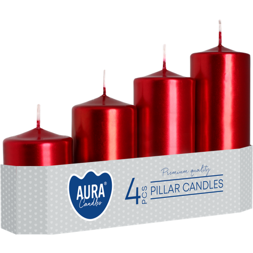Zestaw czterech stopniowanych świec pieńkowych marki AURA w efektownym, czerwonym metalicznym kolorze to doskonały wybór zarówno na co dzień, jak i na wyjątkowe okazje. Walce w tej intensywnej, połyskującej barwie idealnie podkreślą dekoracje świątecznych stołów, glamour aranżacje oraz eleganckie wnętrza. Umieszczone w różnych stylizacjach tworzą ciepłą, luksusową i pełną charakteru atmosferę podczas spotkań. Wotywne świeczki w odcieniu czerwonego metaliku stanowią wyraziste dopełnienie dekoracji sezonowych, pięknie komponując się z zielenią, złotymi akcentami, czernią oraz klasyczną bielą.