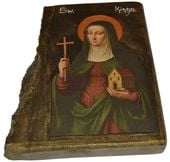 Współczesna ikona na drewnie o wymiarach ok.18 cm x 22,5 cm x 2,5 cm, . Ikona zabezpieczona lakierem i werniksem szelakowym w połączeniu własnej metody transferu na japońskim papierze umożliwia uzyskanie ciekawego efektu nanoszenia obrazu. Widoczne spękania, nierówności, wgłębienia, są zamierzone i celowe z tyłu zawieszka do powieszenia.Na życzenie dedykacja umieszczona na odwrocie reliefem wypukłym gratis.