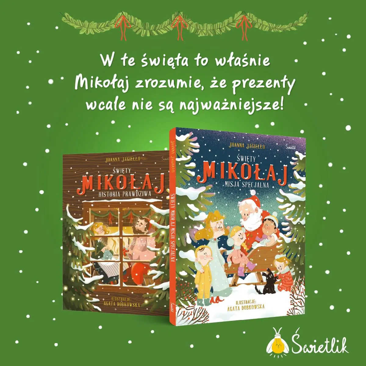 W te święta to właśnie Mikołaj zrozumie, że prezenty wcale nie są najważniejsze! Mikołaj, jego żona Marta i pomocne elfy od wielu lat dbają o to, by dzieci znalazły pod choinką wymarzone prezenty. Dzień przed Wigilią w fabryce zabawek panuje poruszenie – elfy pracują bez wytchnienia, by zdążyć na czas. W tym roku jednak coś się zmienia. Listy od dzieci stają się coraz dłuższe i coraz bardziej wymagające. Ogromna ilość pracy sprawia, że elfy są przemęczone, a Mikołaj zaczyna wątpić w sens swojego zadania… Za radą elfa Elina Mikołaj i Marta wyruszają do wróżki Elaris. To ona podsuwa im pomysł: zanim surowo ocenią prośby z listów, powinni lepiej poznać dzieci, które je napisały. Tak rozpoczyna się misja specjalna. Czy Mikołaj zrozumie, o czym tak naprawdę marzą dzieci i jakie pragnienia kryją się w ich sercach?„Święty Mikołaj. Misja specjalna” to przepiękna historia o tym, że w święta prezenty nie są najważniejsze. Ciepła opowieść Joanny Jagiełło, wzbogacona klimatycznymi ilustracjami Agaty Dobkowskiej idealnie sprawdzi się jako prezent z okazji mikołajek lub świąt Bożego Narodzenia. Jeśli chcesz się dowiedzieć, jak ze zwykłego człowieka, który pragnął czynić dobro, Mikołaj stał się magiczną postacią obdarowującą dzieci na całym świecie, sięgnij po pierwszy tom serii – „Święty Mikołaj. Historia Prawdziwa”.