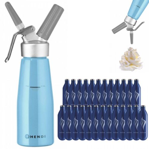Prezentowany model jest dedykowany do użytku z nabojami do syfonów do bitej śmietany (N2O). Można używać ze wszystkimi nabojami N2O dostępnymi w sprzedaży. Szeroki wybór naboi N2O znajdziesz w naszej ofercie. Ze względu na aluminiową konstrukcję, syfonu nie należy myć w zmywarce. Syfon Hendi 975862 ma niebieski kolor.