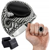 Ten sygnet z czarnym onyksem i wizerunkiem węża wyróżnia się wyszukanym designem łączącym tradycyjne wykonanie ze współczesną stylistyką. Wzór węża otaczającego owalny kamień dodaje biżuterii intrygującego charakteru.