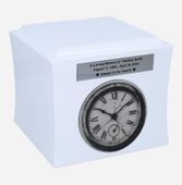 Urna ma kształt eleganckiego pudełka, z delikatnie zaokrąglonymi krawędziami i jest dostępna w kolorze czarnym lub białym. Na froncie znajduje się grawerowana grafika przedstawiająca rozbity zegar, symbolizujący uciekający czas, który dla tej osoby już się zatrzymał. Tuż nad grafiką umieszczona jest spersonalizowana plakietka, na której możesz umieścić imię, daty lub osobiste przesłanie – coś, co najlepiej odda pamięć o ukochanej osobie.