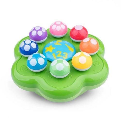 Kwiatek na kołyszącej podstawie zabawi na 4 różne sposoby! Zabawka posiada 4 tryby działania: cyfry, muzyka, kolory i gry. Aby wybrać konkretny tryb, należy nacisnąć na niebieskie kółko, znajdujące się na środku zabawki. W trybie cyfry, zadaniem malucha będzie liczenie kropek, znajdujących się na kolorowych grzybkach, w trybie kolory, poznawanie nazw kolorów widocznych na grzybkowych kapeluszach, w trybie muzyka, grzybki w magiczny sposób przekształcą się w klawisze pianinka, aby maluch mógł zagrać na nich prawdziwy koncert, a w trybie gra, zabawka będzie zadawać pytania dotyczące liczenia i określania kolorów. Zabawka wyposażona jest w regulację głośności oraz wyłącznik.