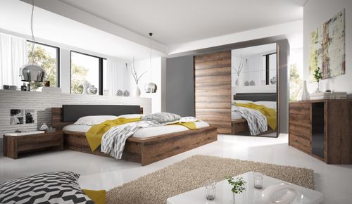 Zestaw sypialniany INDIGO składa się z dużej szafy rozsuwanej posiadającej lustro, która dodatkowo ma dwie szuflady wysuwane na prowadnicach kulkowych ( pełny wysuw ), otwierające się bez konieczności przesuwania drzwi szafy. Ponadto do zestawu dochodzi komoda z otwieranym frontem i czterema szufladami,2x stolik nocny z szufladą także wysuwaną na prowadnicach kulkowych ( pełny wysuw ) oraz łóżko ze stelażem.