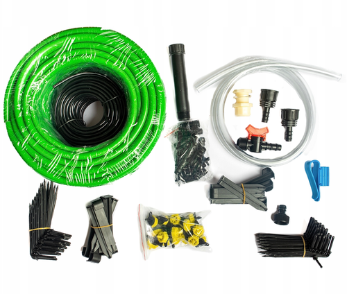 Zestaw zawiera wszystkie niezbędne elementy do szybkiego i samodzielnego montażu: wąż główny, kroplujące emiterki, kroplowniki patykowe, duże kołki mocujące oraz wszystkie potrzebne akcesoria montażowe.