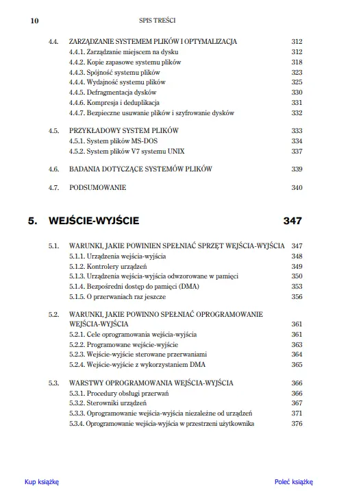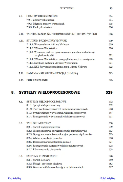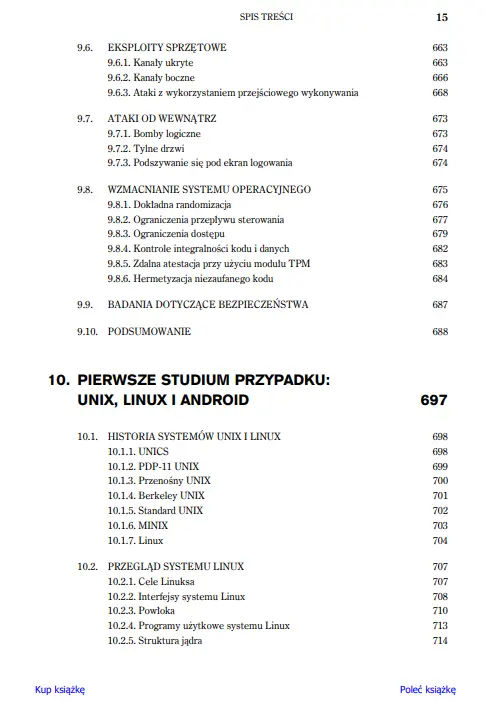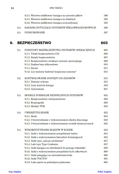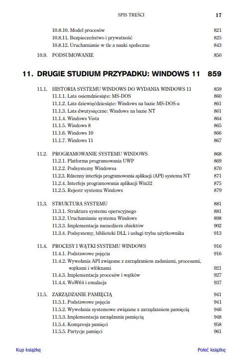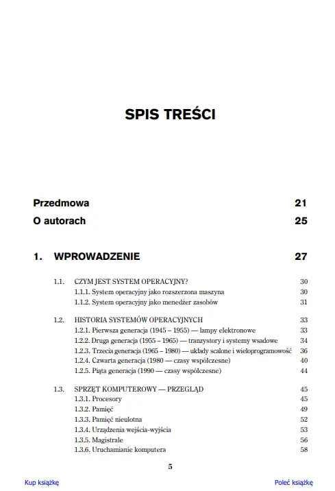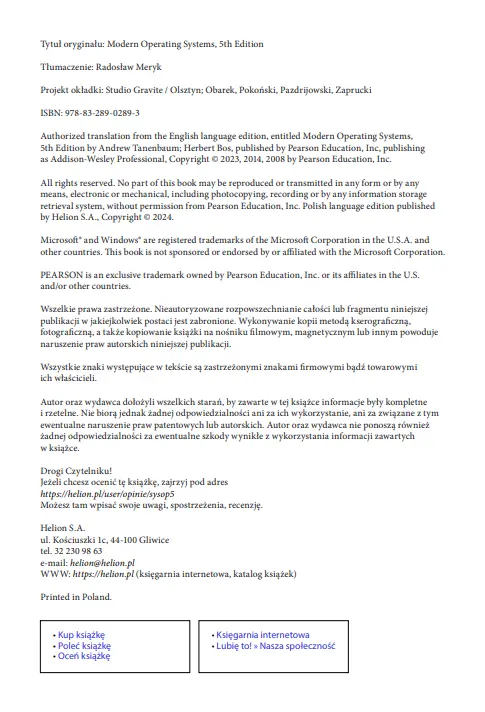 Większość aplikacji i usług jest zależna od interakcji z systemem operacyjnym, dlatego profesjonaliści IT potrzebują głębokiej, a przede wszystkim aktualnej wiedzy w tej dziedzinie. To właśnie zrozumienie systemów operacyjnych pozwala inżynierowi IT na skuteczne diagnozowanie problemów, optymalizowanie wydajności i tworzenie solidnych rozwiązań, które oprą się próbie czasu i podniosą poziom bezpieczeństwa. To piąte, gruntownie zaktualizowane wydanie podręcznika, który doceni każdy student informatyki i inżynier oprogramowania. Książka obejmuje szeroki zakres zagadnień, od podstawowych pojęć po zaawansowaną problematykę związaną z najnowszymi trendami w systemach operacyjnych. Wyczerpująco omawia procesy, wątki, zarządzanie pamięcią, systemy plików, operacje wejścia-wyjścia, zakleszczenia, interfejsy użytkownika, multimedia czy kompromisy wydajnościowe. Szczegółowo, jako studia przypadków, zostały tu opisane systemy: Windows 11, Unix, Linux i Android. Jasny i przystępny styl, a także liczne przykłady i ćwiczenia ułatwiają zrozumienie nawet bardzo skomplikowanych zagadnień. W książce między innymi: podstawowe pojęcia i struktura systemów operacyjnych sprzęt a funkcjonowanie systemu operacyjnego przegląd systemów operacyjnych, w tym internetu rzeczy i systemów wbudowanych systemy: Unix, Linux, Android - procesy, zarządzanie pamięcią, bezpieczeństwo Windows 11 - struktura, procesy i wątki, wirtualizacja, zabezpieczenia projektowanie systemów operacyjnych