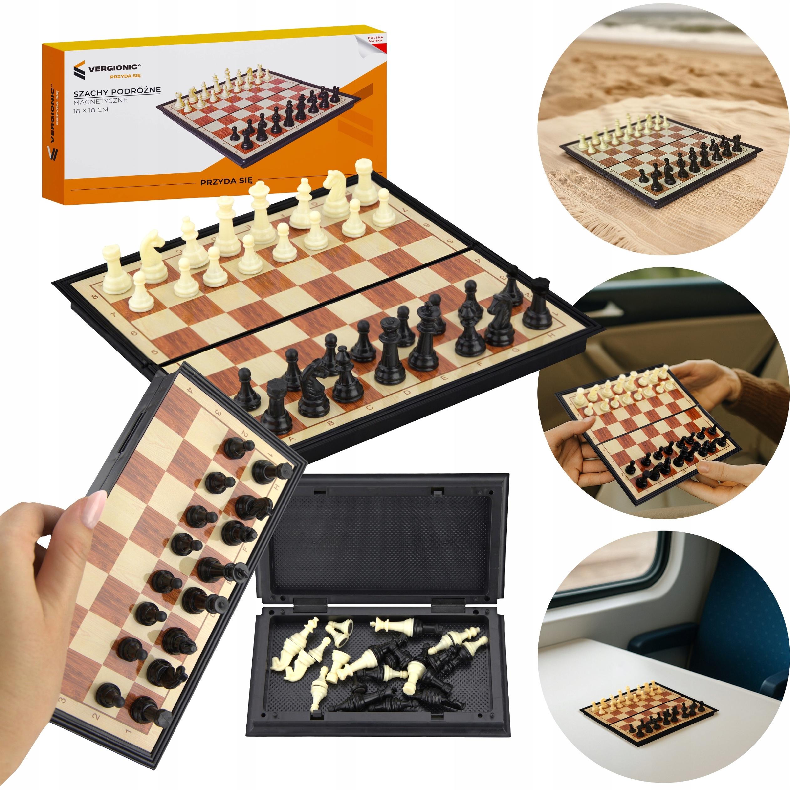 Szachy podróżne magnetyczne Vergionic – kompaktowy zestaw 18×18 cm, idealny do nauki, zabawy i rozgrywek w podróży.
