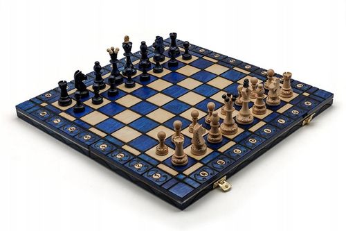 Komplet ten łączy doskonałą jakość wykonania z pięknem designu. Rozłożona szachownica o rozmiarze 42x42x2,5 cm po złożeniu stanowi elegancką kasetę z wkładką z floku, chroniącą figury przed uszkodzeniami. Zawiasy kasety są również chronione tkaniną, aby nie ryć blatu.