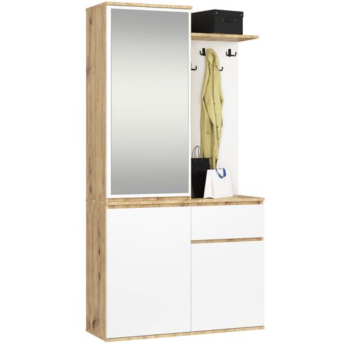 Szafa do przedpokoju z lustrem ENTRO o szerokości 95 cm to idealne rozwiązanie dla tych, którzy szukają wydajnych sposobów na zagospodarowanie niewielkich przestrzeni. Ten duży i funkcjonalny mebel doskonale wpasuje się do wąskiego korytarza lub małego wiatrołapu, oferując zarówno miejsce do przechowywania, jak i nowoczesny styl. Model ENTRO wyposażony jest w praktyczne rozwiązania, takie jak duża szafka z lustrem z drążkiem na ubrania, dwie mniejsze szafki z półkami, szuflada oraz 5 wieszaków w formie haczyków. Dodatkowa półka nad wieszakami pozwala na przechowywanie drobiazgów i codziennie używanych przedmiotów. Dzięki uchylnym drzwiom oraz matowym frontom w kolorze białym na tle matowego korpusu w kolorze Dąb Artisan, szafa prezentuje się elegancko i z klasą.