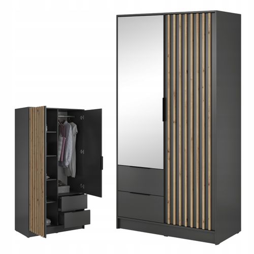 ✨ Dekoracyjne lamele oraz uniwersalna kolorystyka sprawiają, że doskonale komponuje się zarówno z nowoczesnymi, jak i klasycznymi wnętrzami. Dodatkowo, przemyślane detale, takie jak solidne uchwyty i wysokiej jakości zawiasy, zapewniają komfort codziennego użytkowania, a lustro optycznie powiększa wnętrze, dodając mu lekkości.