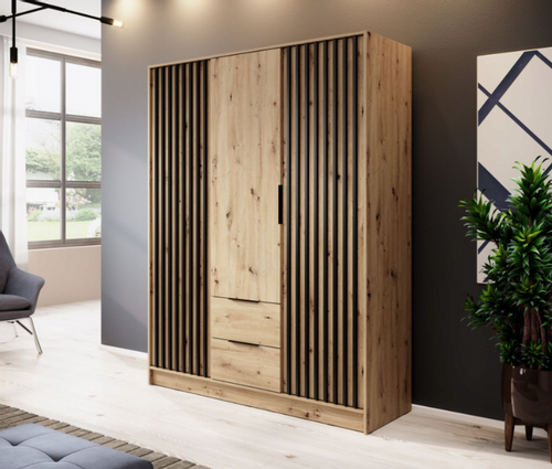 Lamele to absolutny hit w aranżacji wnętrz. Ten model to połączenie funkcjonalności i nowoczesnego designu. Zastosowaliśmy w niej klasyczne uchylne drzwi, głębokie szuflady, oraz pionowe listwy wykonane z MDF 18 mm. Szafa jest dostępna w trzech rozmiarach w kolorach ARTISAN, GRAFIT i SZARY w wersji z lustrem lub bez.