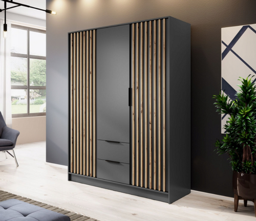 Lamele to absolutny hit w aranżacji wnętrz. Ten model to połączenie funkcjonalności i nowoczesnego designu. Zastosowaliśmy w niej klasyczne uchylne drzwi, głębokie szuflady, oraz pionowe listwy wykonane z MDF 18 mm. Szafa jest dostępna w trzech rozmiarach w kolorach ARTISAN, GRAFIT i SZARY w wersji z lustrem lub bez.