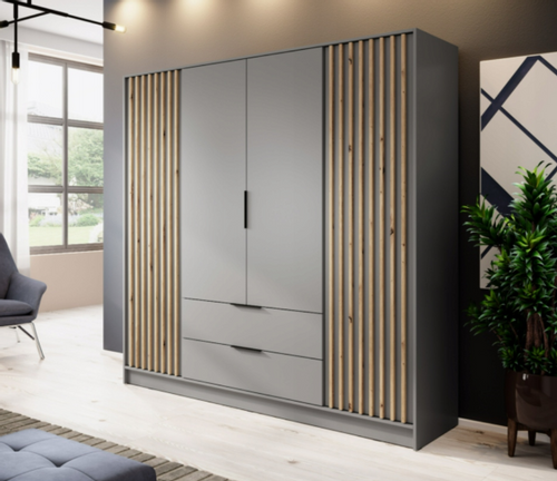 Lamele to absolutny hit w aranżacji wnętrz. Ten model to połączenie funkcjonalności i nowoczesnego designu. Zastosowaliśmy w niej klasyczne uchylne drzwi, głębokie szuflady, oraz pionowe listwy wykonane z MDF 18 mm. Szafa jest dostępna w trzech rozmiarach w kolorach ARTISAN, GRAFIT i SZARY w wersji z lustrem lub bez.