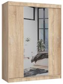Ubraniowa szafa przesuwna z lustrem umieszczonym w centralnej części mebla, wykonana została z wysokiej jakości, odpornej na ścieranie płyty laminowanej Kronospan. Zarówno korpus mebla, jak i częściowo każde z 2 drzwi poruszających się na metalowych prowadnicach, utrzymane zostały w ciepłej kolorystyce dębu sonoma. Wnętrze szafy podzielone zostało funkcjonalnie na 2 części. Z lewej strony zamontowano umieszczone jedna nad drugą, obszerne półki (5 szt.). Prawą część szafy stanowi przestrzeń na ubrania wiszące. Zainstalowano w niej jedną górną półkę, pod którą zamocowany został metalowy drążek.