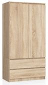 Szafa dwudrzwiowa z szufladami to uniwersalny i praktyczny mebel, który znakomicie uzupełni wyposażenie sypialni, przedpokoju czy pokoju dziennego we wnętrzach typu studio. Eleganckie wykończenie oraz kolorystyka dąb sonoma sprawia, że szafa idealnie wkomponuje się w aranżację klasyczną i nowoczesną. Szafa wyposażona została w dwie pojemne i umieszczone na prowadnicach kulkowych szuflady, które znakomicie nadają się do przechowywania elementów garderoby lub zapasowych poszew na kołdry i poduszki, prześcieradeł, obrusów czy koców. W części mebla umieszczonej za uchylnymi drzwiami znajdują się cztery pojemne półki oraz drążek na wieszaki. Półki można przeznaczyć na swetry, bluzki, torebki, ale także na przykład na ręczniki. Z kolei drążek sprawdzi się jako miejsce do zawieszenia garniturów, sukienek, spódnic oraz odzieży wierzchniej, takiej jak płaszcze lub kurtki. Mebel charakteryzuje się starannym wykonaniem z najwyższej jakości płyty laminowanej, która jest odporna na ścieranie. Krawędzie szafy zostały wykończone estetycznym obrzeżem ABS.