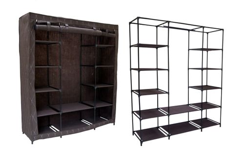 Wytrzymały metalowy stelaż sprawia, że szafa jest stabilna i solidna, a materiały tekstylne gwarantują, że nic nie wniknie do wnętrza, jednocześnie zapewniając przepływ powietrza, co jest niezwykle istotne przy dłuższym przechowywaniu ubrań. Zamki błyskawiczne na froncie pozwalają na łatwe dostępu do zawartości w każdej chwili, a ich niezależna konstrukcja sprawia, że korzystanie z szafy jest szybkie i komfortowe.