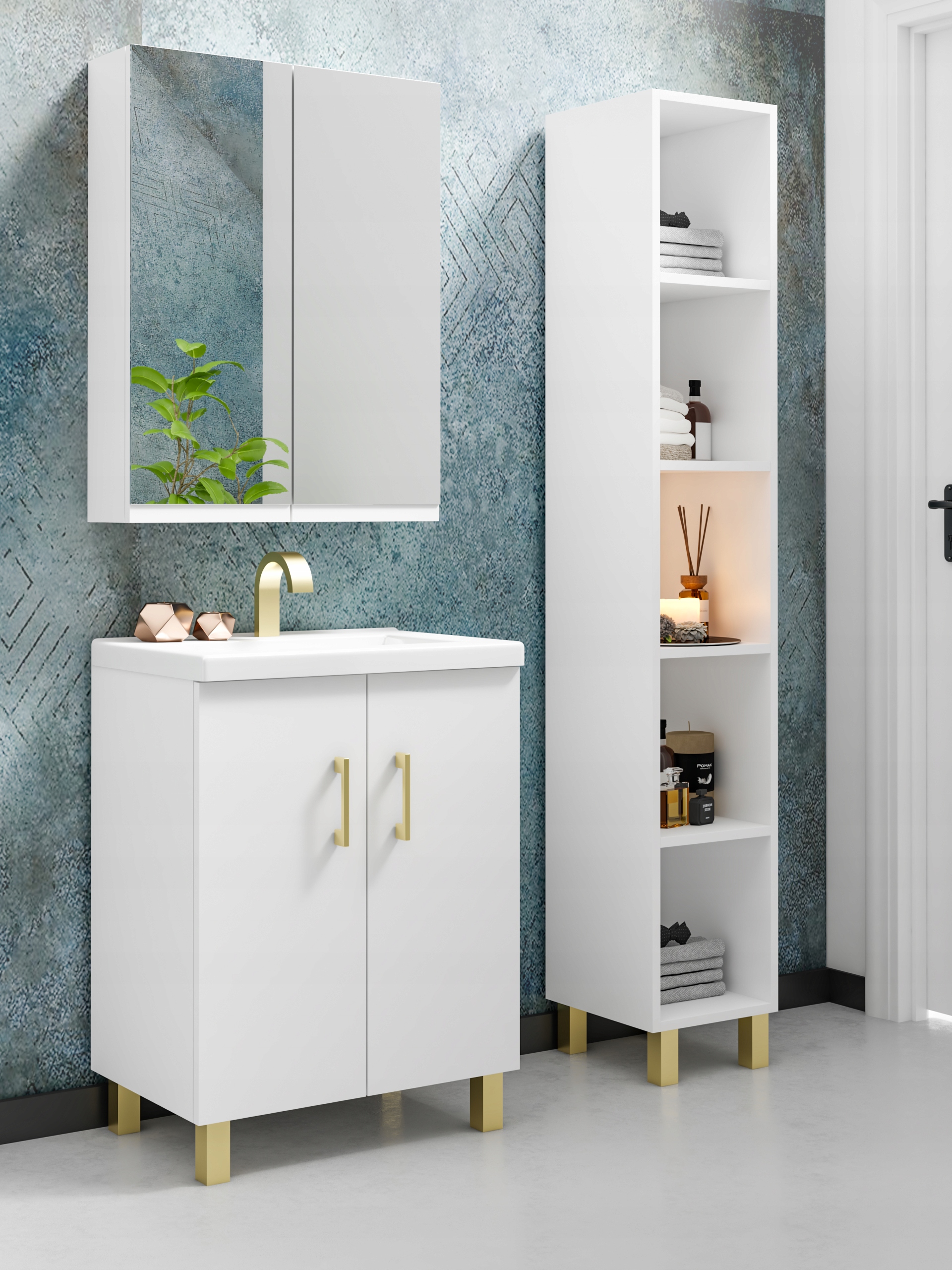 Marzysz o tym, żeby Twoja łazienka była zarówno stylowa, jak i funkcjonalna? Szafka łazienkowa Viki 60 z umywalką w kolorze białym z uchwytami oraz nózkami w kolorze złotym to strzał w dziesiątkę! Dzięki jej nowoczesnemu wyglądowi z pewnością wpasuje się w każdy wystrój, a przy tym zapewni maksimum funkcjonalności.