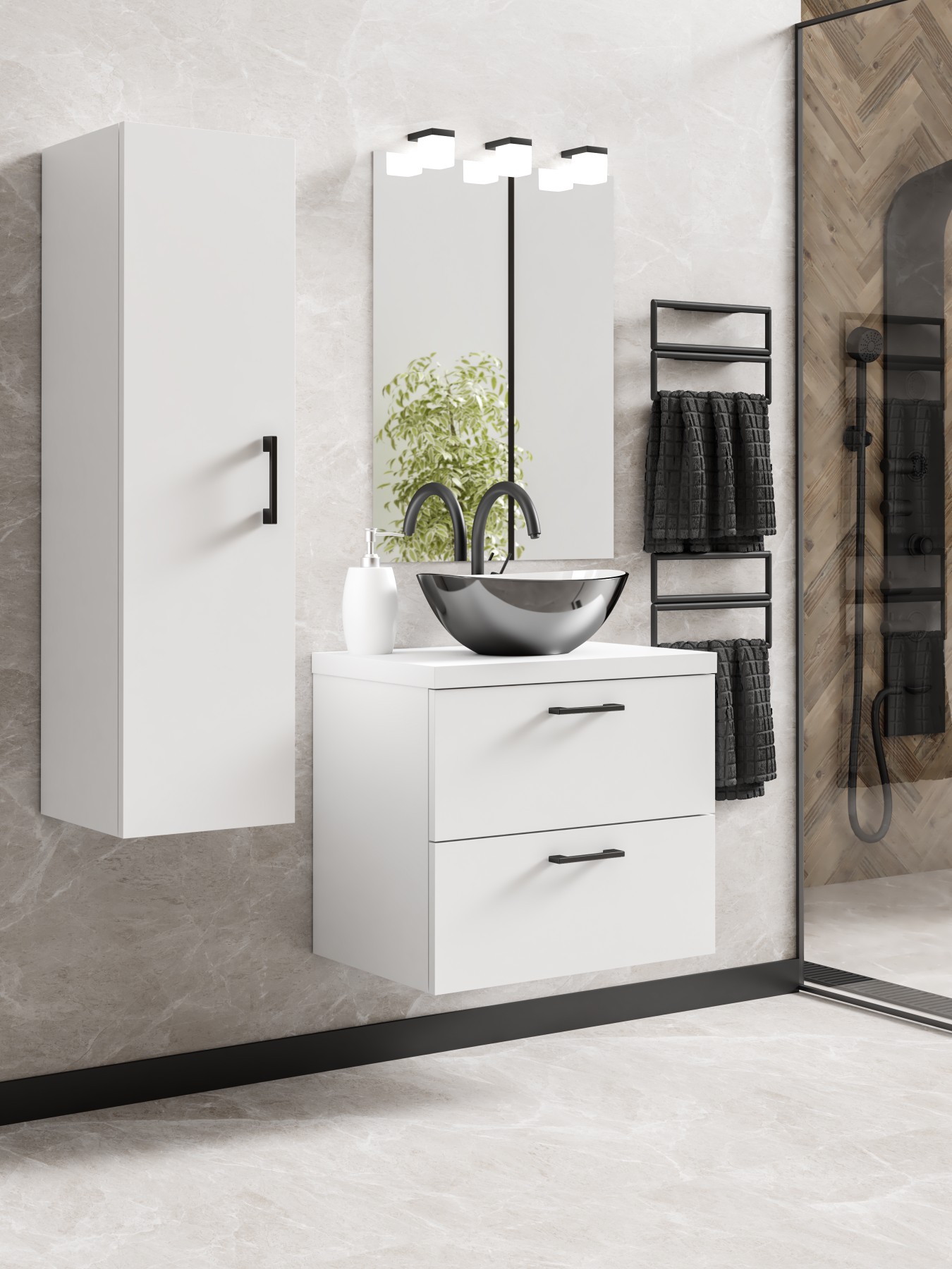 Szafka łazienkowa LUNA 50 to świetne rozwiązanie dla tych, którzy stawiają na styl i funkcjonalność w swojej łazience. Zestaw obejmuje elegancki blat oraz umywalkę nablatową Elza w klasycznym kolorze czarnym, który doskonale ożywi każdy wystrój. Dzięki wysokiej jakości płycie laminowanej o grubości 16 mm, szafka jest nie tylko trwała, ale także łatwa w utrzymaniu czystości.