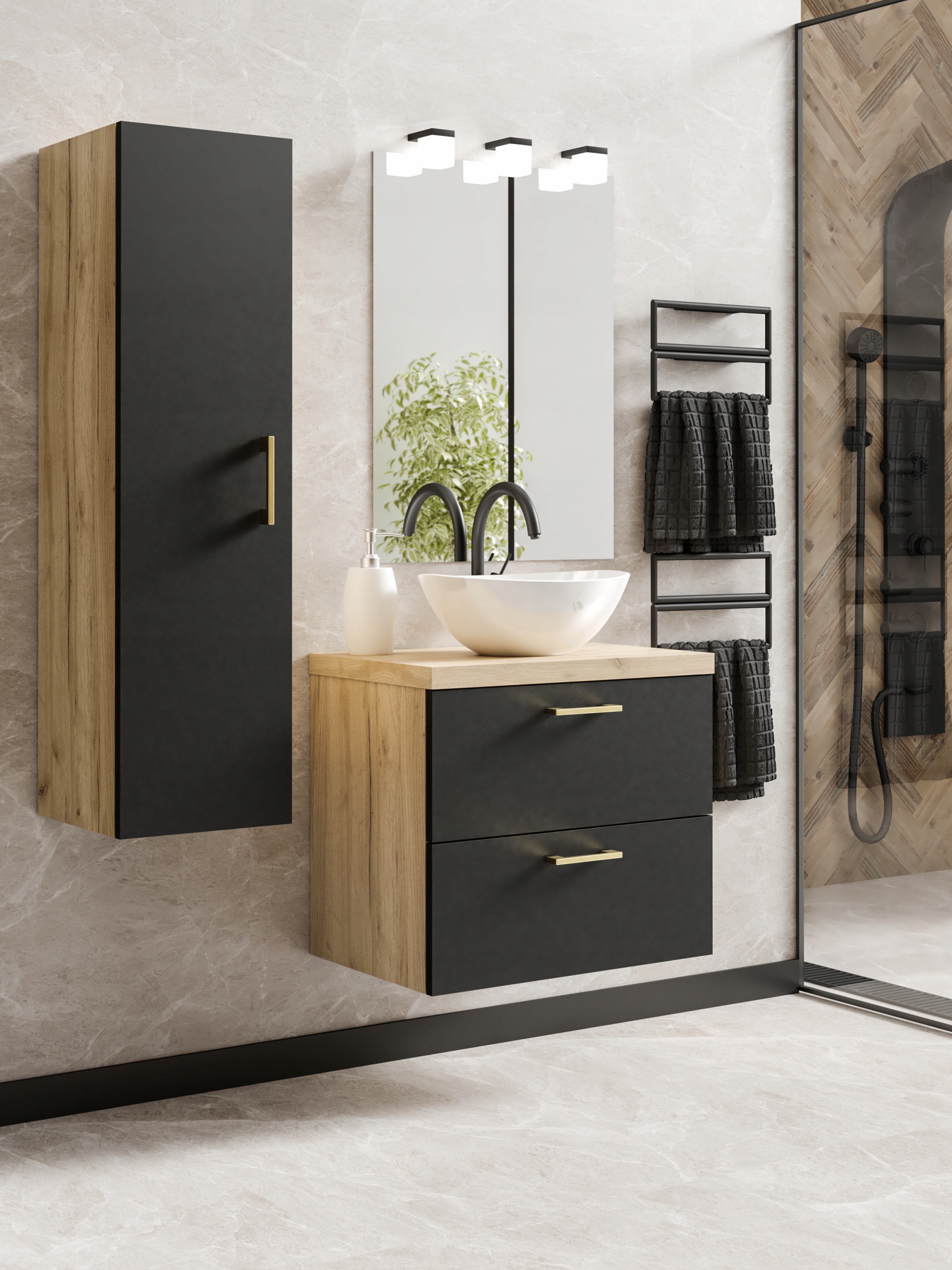 Pamiętaj, że nie zawiera zestawu baterii ani syfonu. Kolor dąb craft złoty, czarny pięknie wpisuje się w nowoczesne wnętrza, dodając im stylu i elegancji. Jeśli planujesz zaaranżować swoją łazienkę w przemyślany sposób, szafka LUNA 50 to trafny wybór. Zajrzyj też do naszej oferty, by kompleksowo urządzić swoje wnętrze.