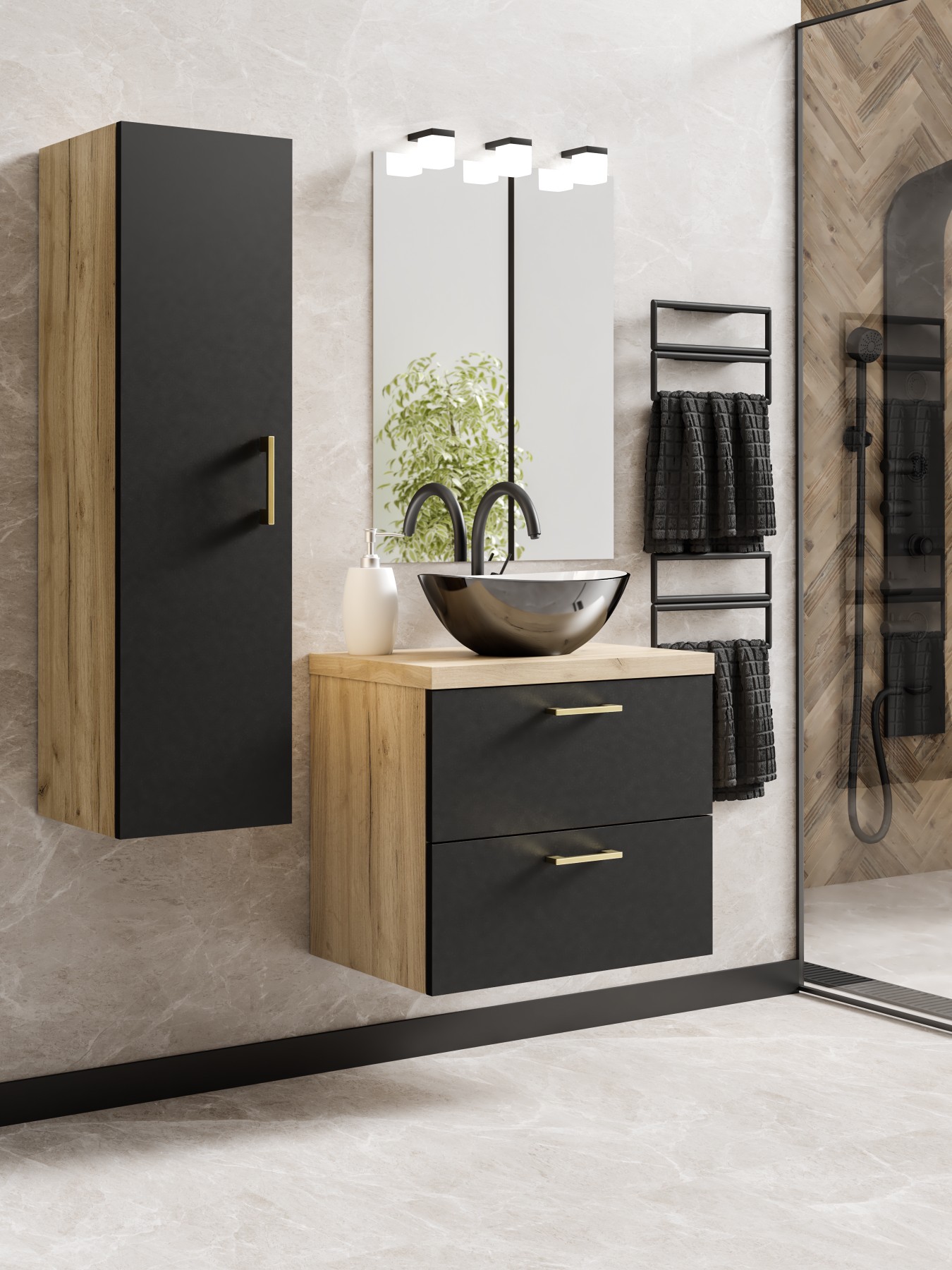 Pamiętaj, że nie zawiera zestawu baterii ani syfonu. Kolor dąb craft złoty, czarny pięknie wpisuje się w nowoczesne wnętrza, dodając im stylu i elegancji. Jeśli planujesz zaaranżować swoją łazienkę w przemyślany sposób, szafka LUNA 60 to trafny wybór. Zajrzyj też do naszej oferty, by kompleksowo urządzić swoje wnętrze.