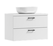 Szafka została wykonana z solidnej płyty laminowanej o grubości 16 mm, a jej pogrubiany blat o grubości 32 mm dodaje nie tylko trwałości, ale i eleganckiego wyglądu. Dwie przestronne szuflady z cichym domykaniem stwarzają wygodne miejsce do przechowywania, a pierwsza z nich ma dodatkowo zaprojektowane miejsce na syfon. Dzięki otworom w blacie pod umywalkę i baterię, montaż jest prosty i szybki. Metalowe zawieszki sprawiają, że zawieszenie szafki na ścianie to wyjątkowo łatwe zadanie.