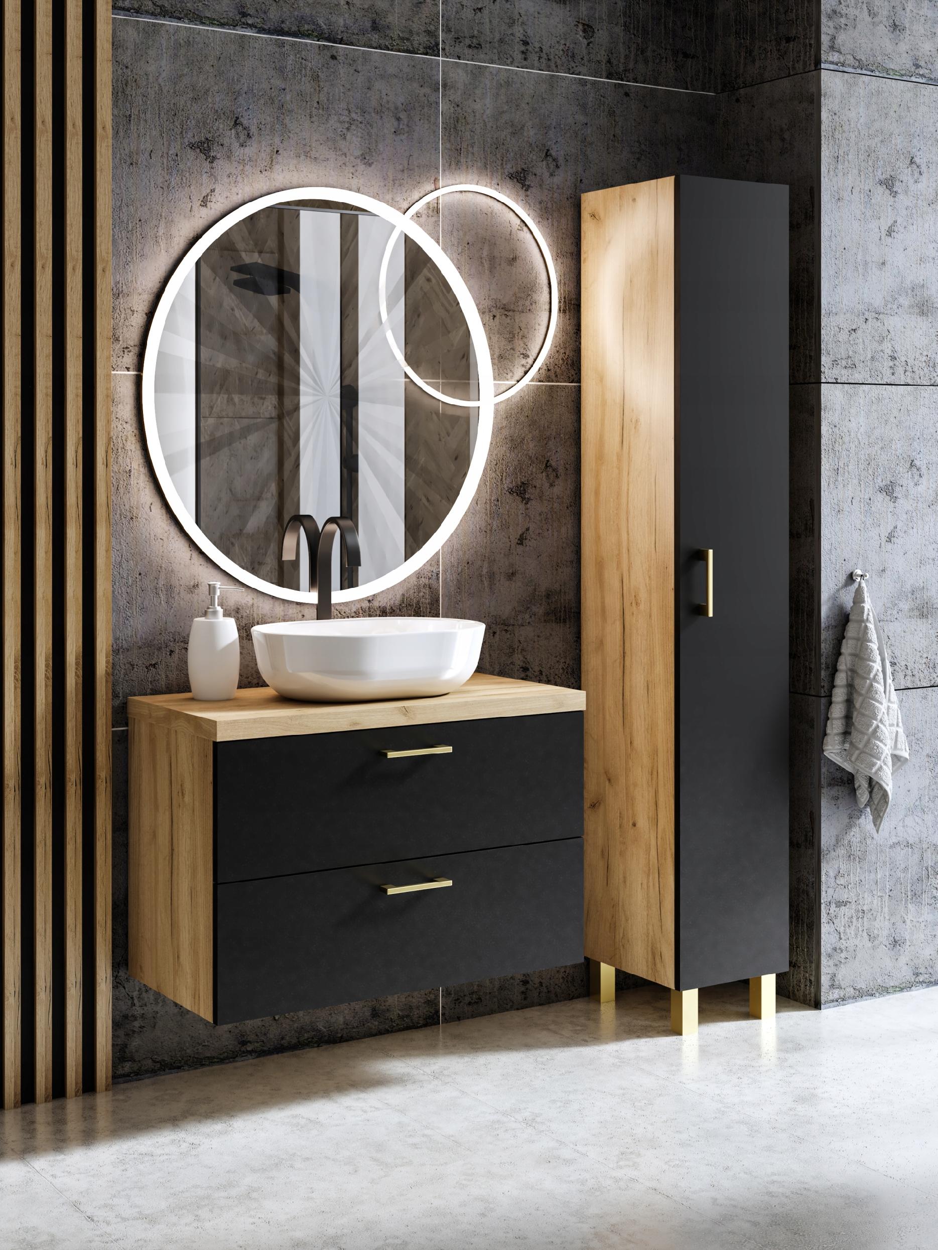 Szafka łazienkowa LUNA 80 to nowoczesne, funkcjonalne rozwiązanie do każdej łazienki. Wykonana z płyty laminowanej o grubości 16 mm, z pogrubianym blatem o grubości 32 mm, zapewnia trwałość i estetyczny wygląd. Dwie pojemne szuflady z cichym domykaniem oferują wygodną przestrzeń do przechowywania, a pierwsza szuflada została zaprojektowana z miejscem na syfon. Blat posiada otwory pod umywalkę oraz baterię, a metalowe zawieszki umożliwiają łatwe zamocowanie szafki na ścianie.