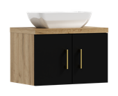 W zestawie znajduje się umywalka nablatowa o wymiarach: wysokość 13,5 cm, szerokość 46 cm, głębokość 33 cm. Wykonana z ceramiki sanitarnej w kolorze białym, doskonale komponuje się z szafką, podkreślając nowoczesny charakter łazienki. Brak otworów na baterię i przelewowy otwór zapewnia większą elastyczność w doborze armatury.