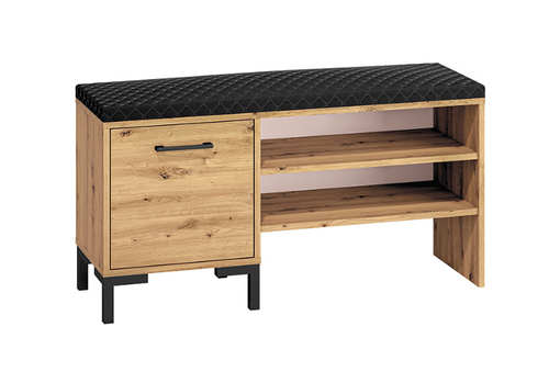 Prosta szafka na buty świetnie ociepli wnętrze po przez zastosowany bardzo modny dekor Dąb Artisan. Czarne uchwyty kontrastują z drewnianymi frontami, a jednocześnie współgrają z prostymi nóżkami w tym samym kolorze, nadając szafce nowoczesnego i zarazem eleganckiego wyglądu. Szafka na buty NIVA to nowoczesna i elegancka szafka do przedpokoju, która wpisuje się zarówno w loftowy jak i klasyczny styl.