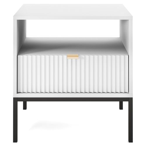 Szafka nocna wyposażona jest w przestronną półkę, która nie tylko zapewnia dużo miejsca do przechowywania, ale także wygląda bardzo elegancko. Na wierzchu półki możesz umieścić lampkę nocną, książki, czasopisma lub inne przedmioty, które potrzebujesz mieć pod ręką w nocy oraz podczas relaksu w ciągu dnia. Piękne ryflowanie na froncie szuflady sprawia, że mebel wyróżnia się spośród innych i naprawdę przyciąga wzrok. Warto zwrócić uwagę także na wyjątkowy, aluminiowy uchwyt w kolorze złota, który dodaje szafce nowoczesności i elegancji.