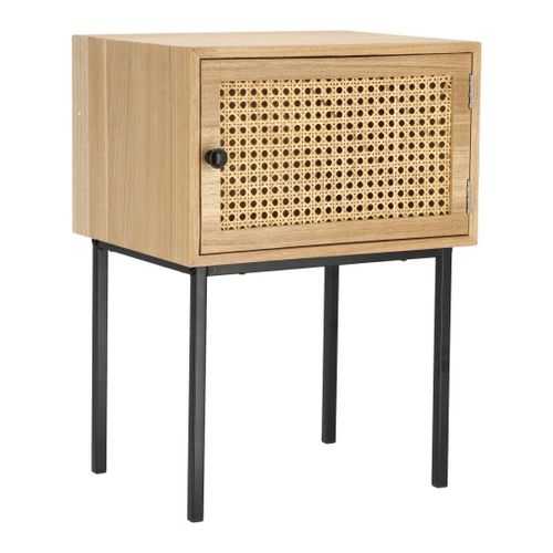 Nasza szafka nocna wyróżnia się unikalnym frontem wykończonym naturalną plecionką wiedeńską, która wprowadza do wnętrza nutkę stylu Vintage. Metalowy uchwyt frontu dodaje jej nowoczesnego charakteru, sprawiając jednocześnie, że korzystanie z szafki jest niezwykle wygodne. Główna konstrukcja mebla wykonana z wytrzymałej płyty MDF z okleiną imitującą drewno zapewnia trwałość i estetykę na długie lata.