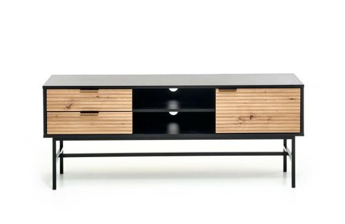 Kolorystyka dąb artisan połączona z elegancką czernią sprawia, że szafka RTV Nihala wpasuje się doskonale w loftowe i nowoczesne wnętrza. Wysokiej jakości fronty szafek dodają ozdobnego akcentu, podkreślając unikalny charakter mebla.