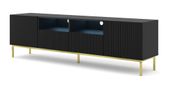 Szafka RTV świetnie wpasuje się w aranżację salonu, umożliwiając funkcjonalne przechowywanie. Posiada szafki boczne, dwie praktyczne szuflady i dwie otwarte półki z otworami na kable, które doskonale sprawdzą się jako miejsce na dekodery.