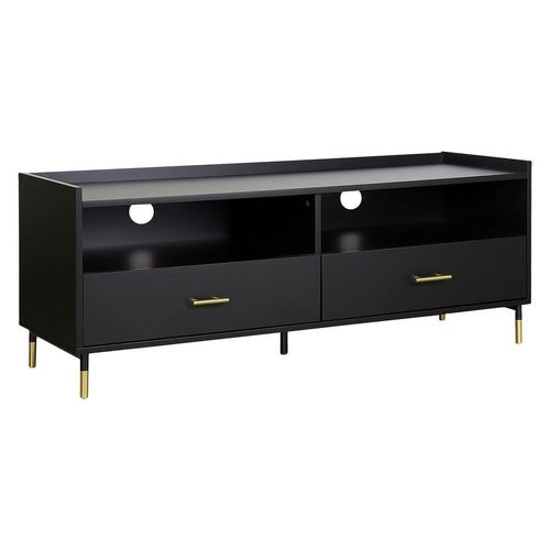 Stojąca szafka RTV Tedy to elegancki, stylowy mebel idealny do salonu w stylu holenderskim lub minimalistycznym. Szafka wykonana jest z wytrzymałej płyty MDF i wsparta na wysokich metalowych nóżkach. Czarny ebel został ozdobiony złotymi elementami. Złote uchwyty i złote zakończenie nóżek to dodatki, które dodają uroku i nietuzinkowego wyglądu. Już dziś skorzystaj z darmowej wysyłki przy zamówieniach powyżej 50 zł.
