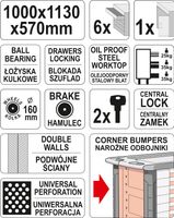Oprócz przestrzeni zagospodarowanej szufladami, szafka ta posiada zamykane półki przeznaczone na większe narzędzia.