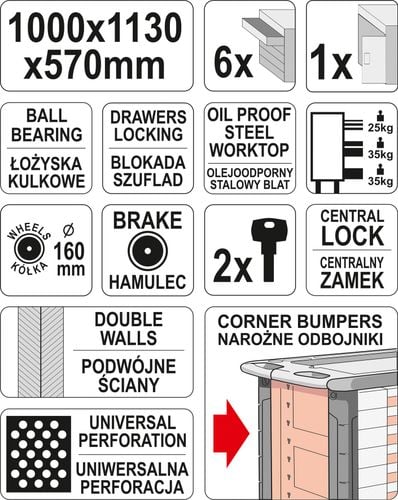 Profesjonalna szafka serwisowa wyposażona w 6 centralnie zamykanych szuflad.